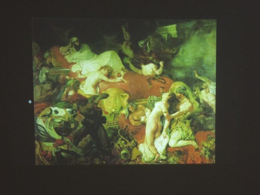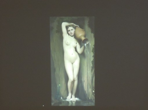まずは、新古典主義とロマン主義の代表的な画家たちの作品をスライドで見ながら、その作風の違いを検討していきます。新古典主義の代表がアングルだとするとロマン主義は、ドラクロワ。