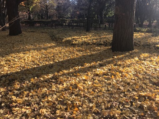 大きなイチョウは、太陽の光でキラキラ黄金色。