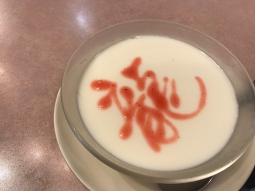 *オマケ。デザートの杏仁豆腐に、お店の方がその場でいろんな字を描いてくれました。いちごジャムの「龍」は、龍といえばこの人!の熟練メンバーのお腹の中へ♡