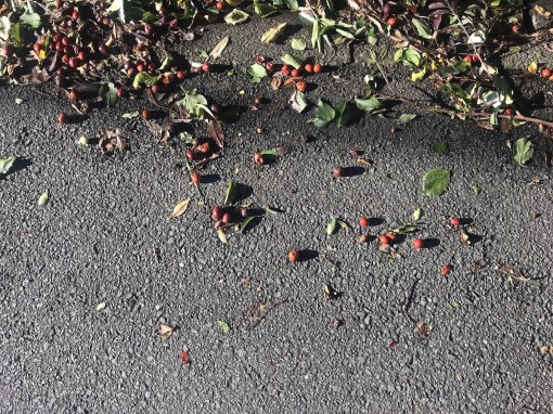 朝の散歩道には、強い風で落ちた紅い実がたくさん。