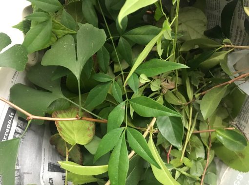 *先生が当日の朝切ってきてくれた葉っぱ。捨てるのはかわいそうで私は家に持って帰って花瓶に飾りました。びっくりするほどいろんな種類の葉っぱがあった。夢中になって葉っぱを切る重松さんの姿が目に浮かんで思わず笑顔になっちゃった。重松さんと私の共通点は、こんなコドモゴコロ、かな(笑)