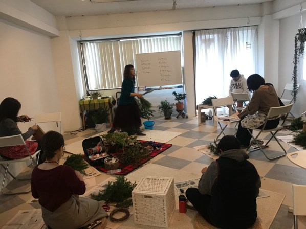 グリーンフォレストリースは、さまざまな種類のグリーン、たとえば柊やヒバ、ヒノキ、ブルーアイス・・・などなどを組み合わせてリースを作ります。木や葉を触った時の手の感触、リースに葉を重ねるたび、葉ごとに違ういい香りで深呼吸。作っているうちに無我夢中になっています。最後にこの世界でたった一つの自分のリースが出来上がる、その喜び・・・・・