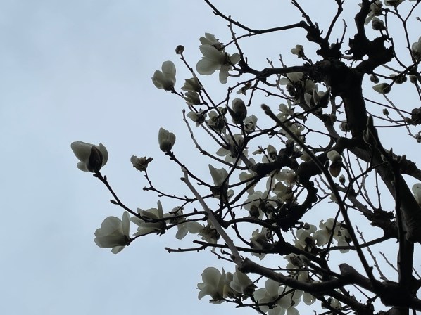 でも窓の外を見ると、庭の梅の花は散り、木蓮の白い花や杏の花が咲き始め、鳥がその花々をついばんでいました。