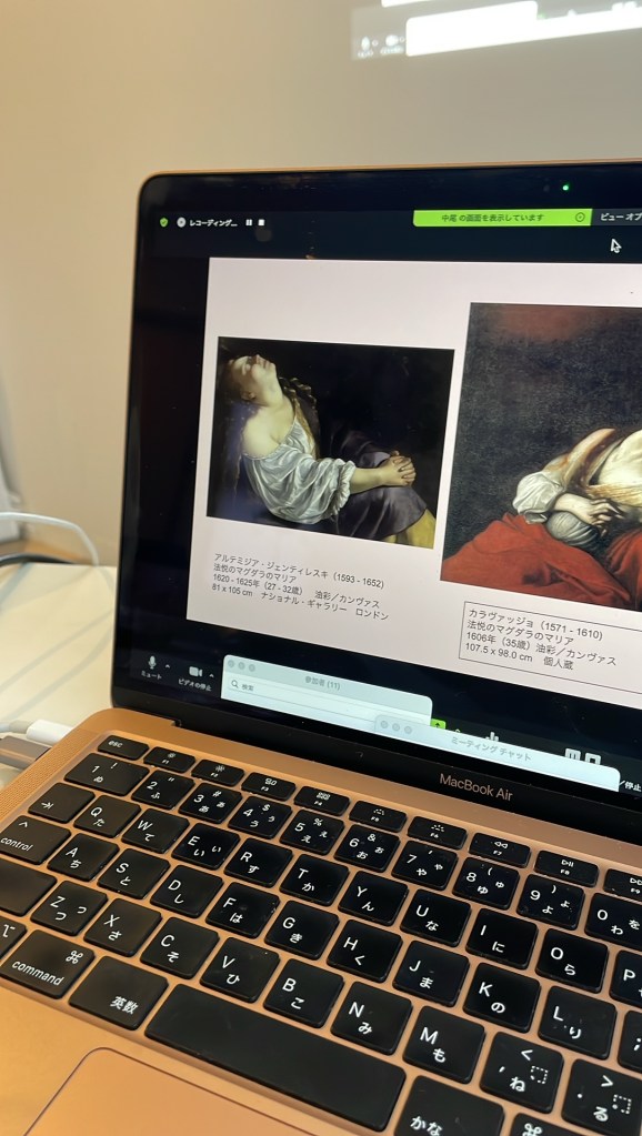 その後、11月のテーマ「マグダラのマリア」を題材にした作品を見て、先生の美術史的知識を加えながら、参加者全員で思い思いに語り合いました。マグダラのマリアは、多くの芸術家が題材にしています。たとえば、
