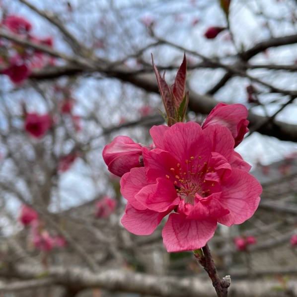この梅は、「思いのまま」という品種です。一本の木に、白梅、紅梅、そして白にピンクが混じった花が咲きます。どのあたりに何色が咲くのか?翌年もいろが混じるのかはわかりません。まさに、梅の「思いのまま」に咲く野生の梅だそうです。我が家の庭で咲いています。