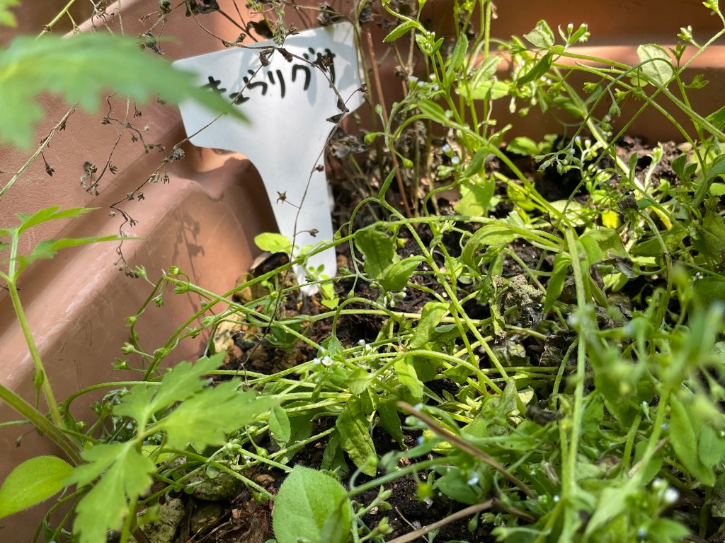 なんだかすっかり嬉しくなりました。キュウリグサは雑草という名ではなくれっきとしたお名前があるのであ〜る。そうなると他の雑草も可愛く見えてきます。そもそも雑草って名前の植物はないのですよね。それぞれにちゃんと名前があって、華々しくはないけれど可憐に逞しく季節を彩っているのです。人間は、分けてみたり、なんでも同じにしたがったり、ややこしい。