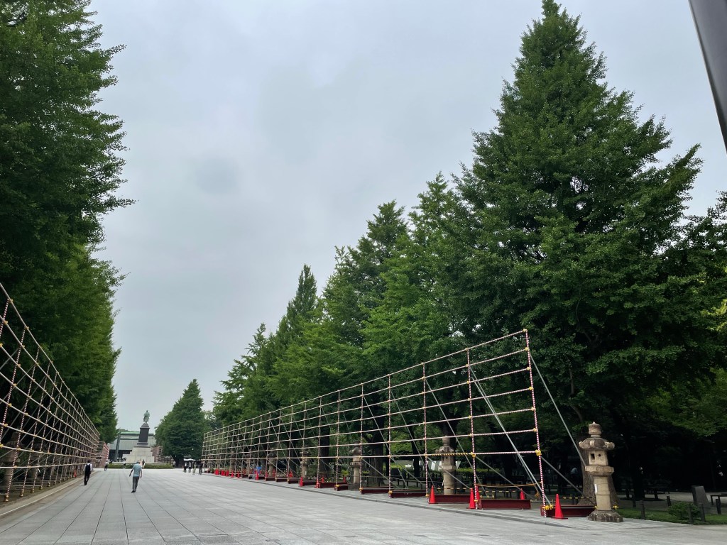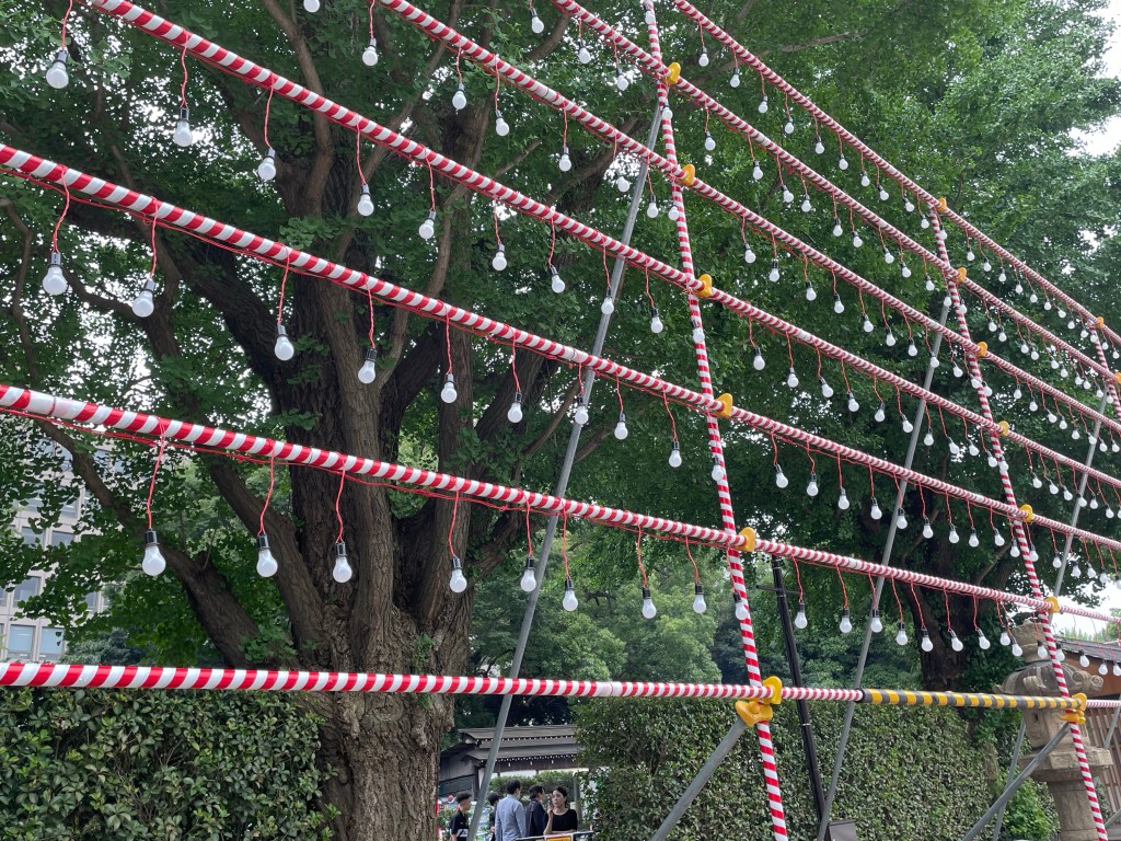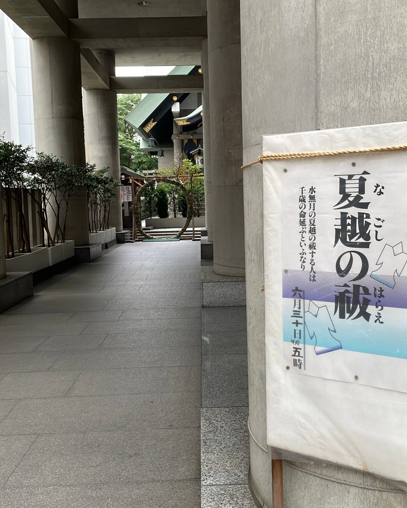 お向かいの築土神社は、茅の輪ができています。奥に見えますか?