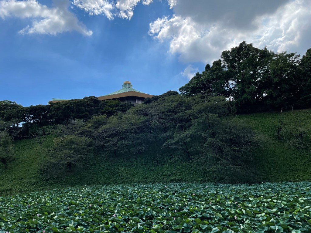 *遠くに見えるのが武道館。手前はお濠を埋め尽くす蓮の葉と花。まだまだこんなに水面を埋め尽くしています!