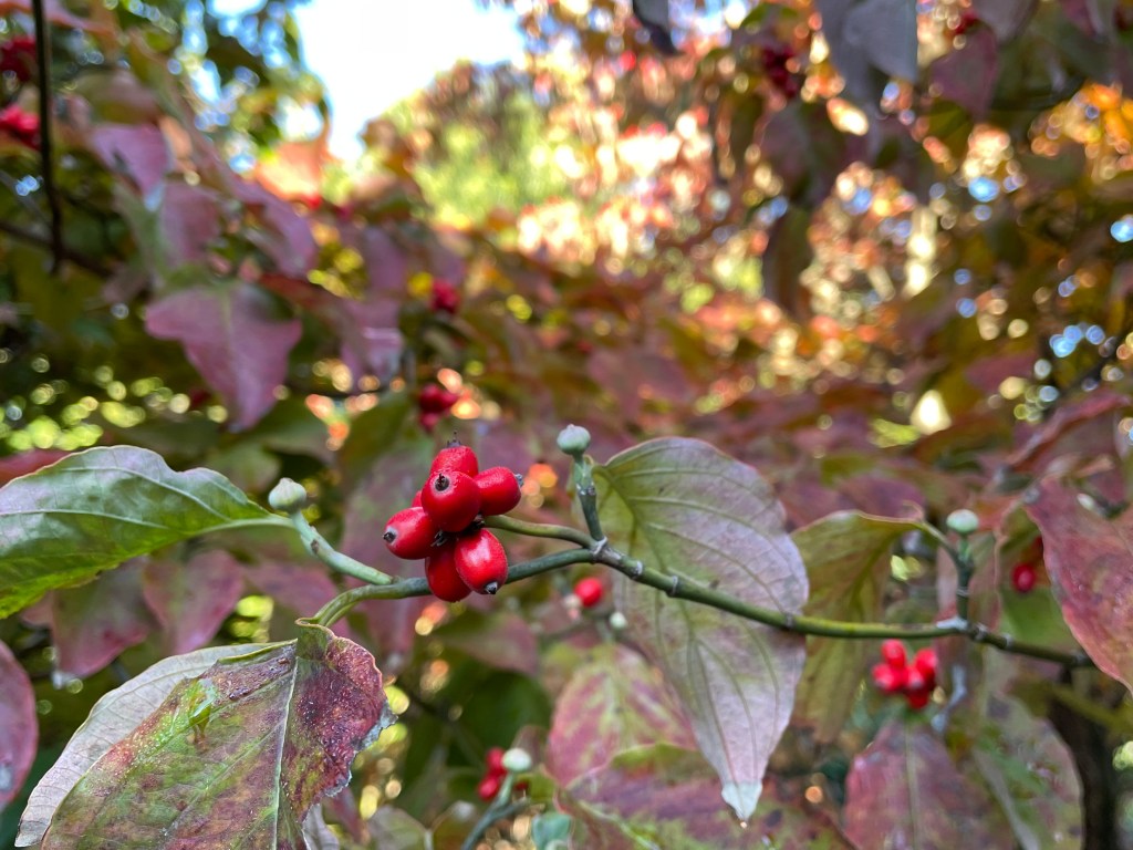 夏があまりにも暑かったから、さすがの鳥も例年よりも虫を食べず、樹々の葉は虫さんたちの食べ放題だったとか。でもいつもの桜の木の葉は、紅葉していました。