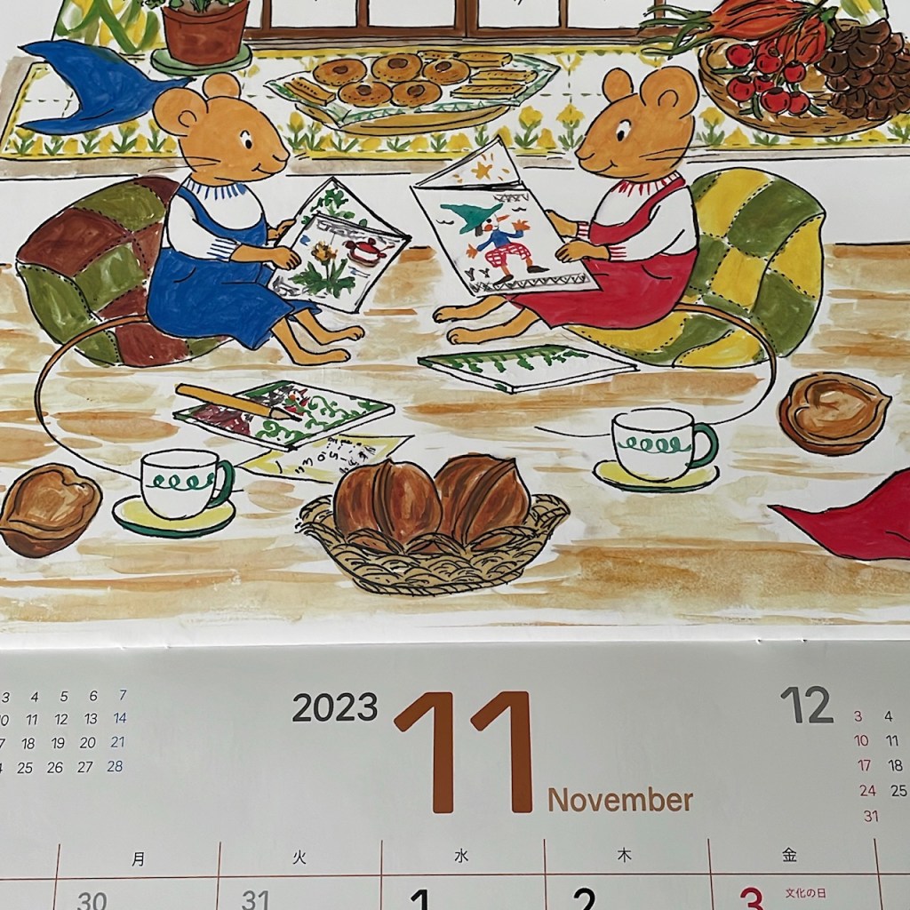 *これはカレンダーのぐりとぐら。この季節の部屋遊びのぬくぬくした暖かさが出ている絵だなぁと思いました。外は木枯らしが吹いているのかも。