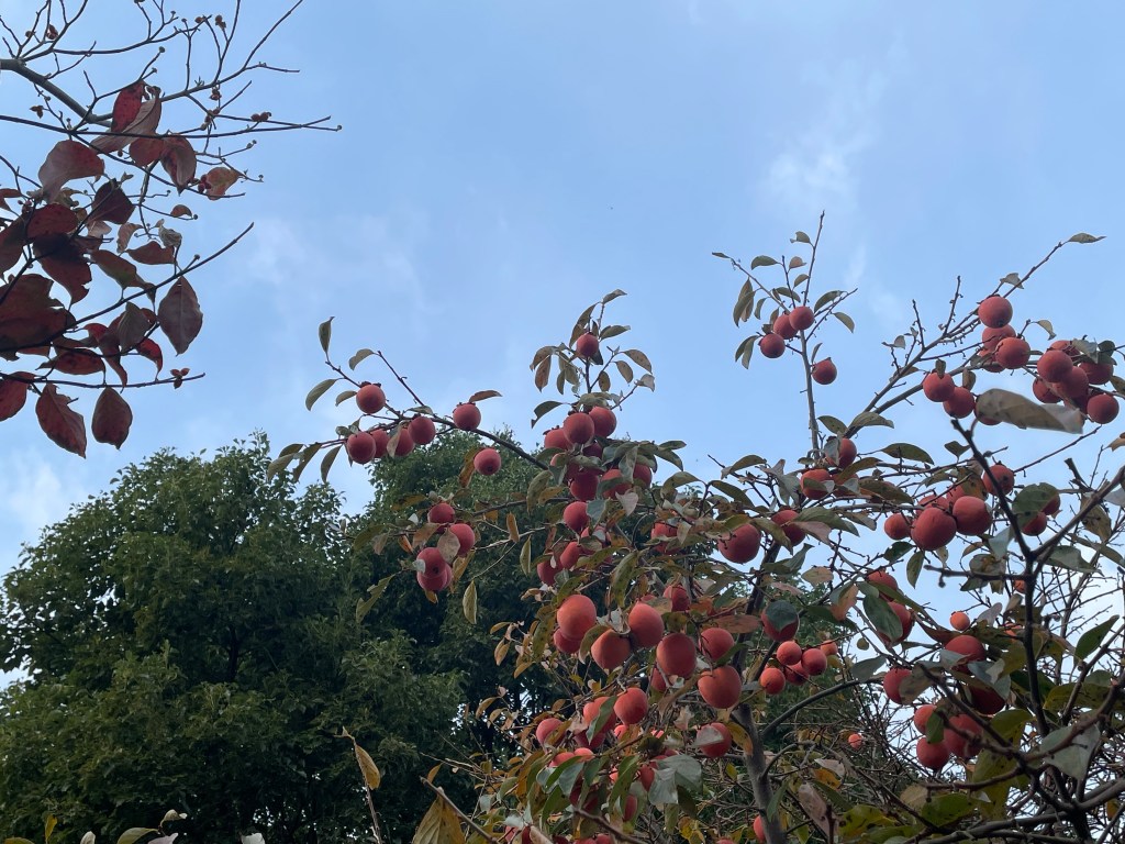 朝の散歩に出かけると、水色の空に柿の実やハナミズキの赤い葉、実がきれいでした。