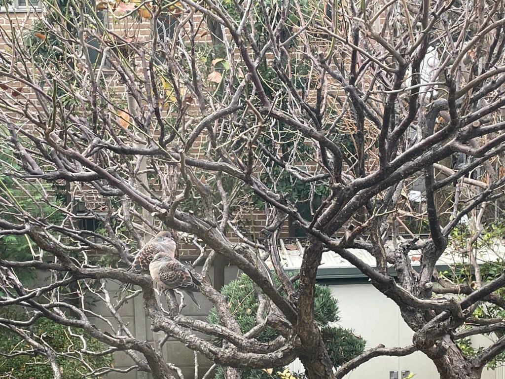 *クリスマスイヴの朝の風景。我が家の梅の木に仲良し二人組。仲良きことは美しきかな。