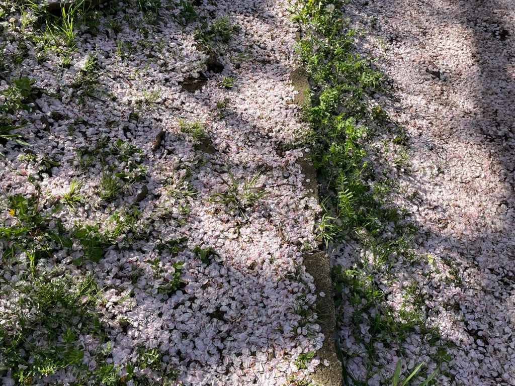 春の嵐の後、地面は桜色のじゅうたん。