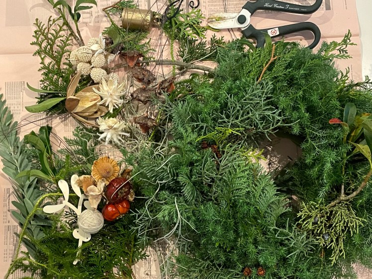 出来上がったリースを家に飾った日から、深緑の姿、その匂い、その感触に触れるたびに、